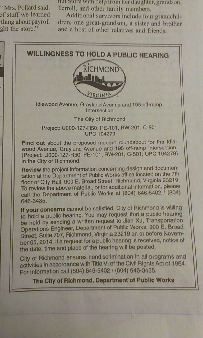 The following announcement was posted in the Oct 2-4 edition of the Richmond Free Press: