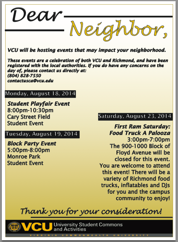 7. Tito Luna of VCU introduced residents to the office of Institutional Equity and Community Engagement. They are looking to do a survey on VCU’s impact on the surrounding community. Dr. Peyton McCoy, the RNA’s VCU liaison, will be reaching out to residents with more information.